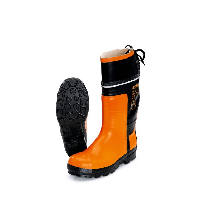 Bottes anti-coupures en caoutchouc (noir/orange) pour le travail à la tronçonneuse, tige lacée, bandes réfléchissantes, permet le port de crampons en acier. EN ISO 345, Classe 3.