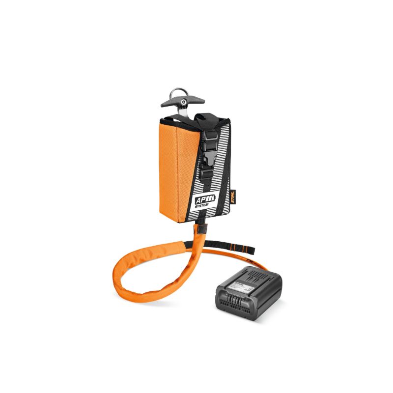 Vous pouvez utiliser en option la batterie AP 500 S STIHL de plus grande capacité et ainsi réaliser plus de coupes avant de devoir remplacer la batterie. La sangle sert également de protection contre les chutes. Le boîtier de la batterie est équipé d’un dispositif de largage d’urgence et d’une protection contre les surcharges.