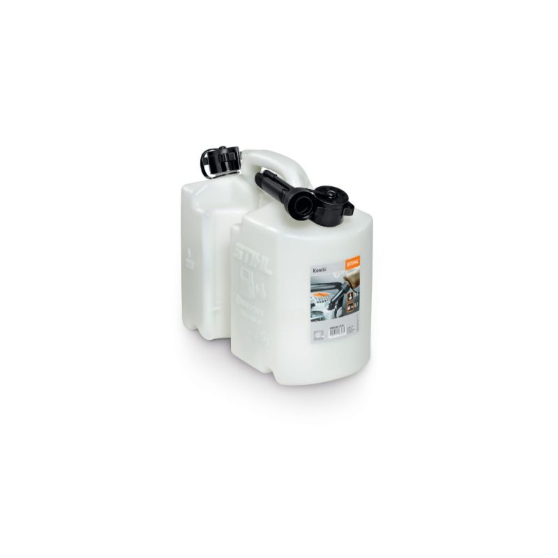 Bidon combiné pour 5 litres de carburant et 3 litres d'huile de chaîne adhésive. Homologation ONU