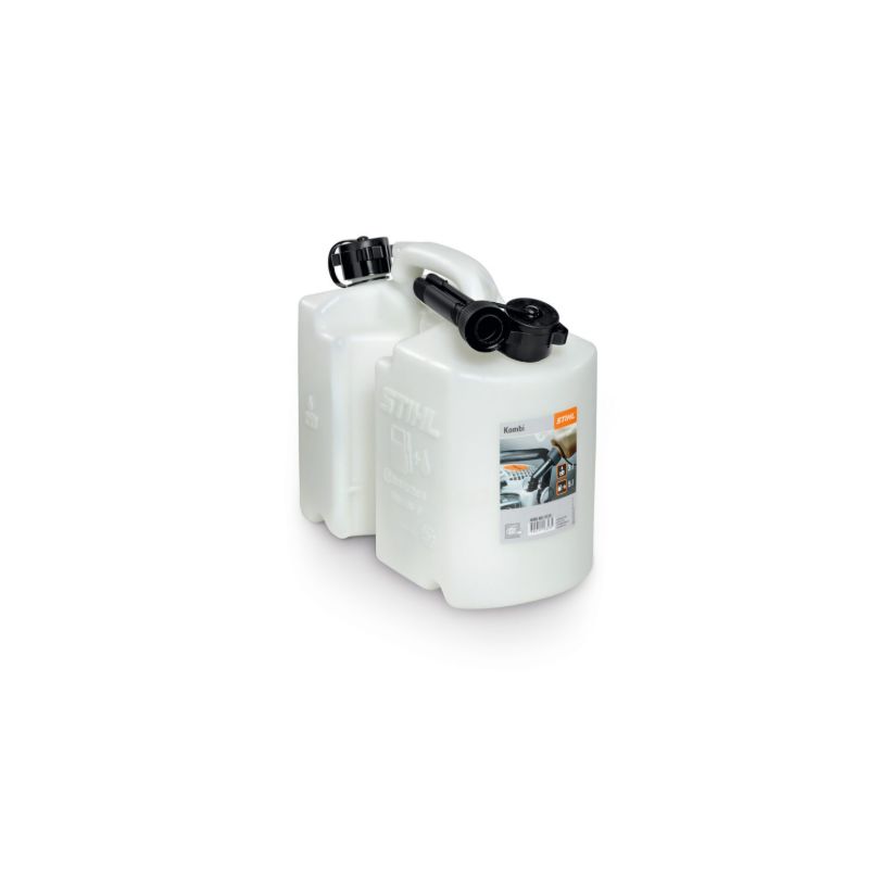 Bidon combiné transparent pour 5 litres de carburant et 3 litres d'huile de chaîne adhésive. Homologation ONU.