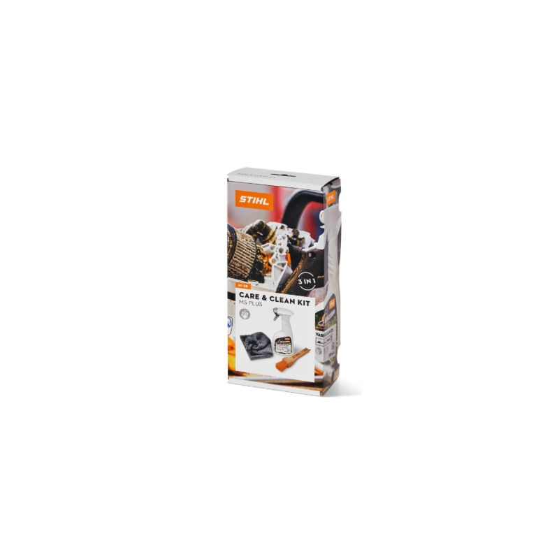Le Care & Clean Kit MS PLUS contient les essentiels pour le nettoyage et l‘entretien de l’outil de coupe, du filtre à air HD2 et du carter moteur de votre tronçonneuse STIHL :